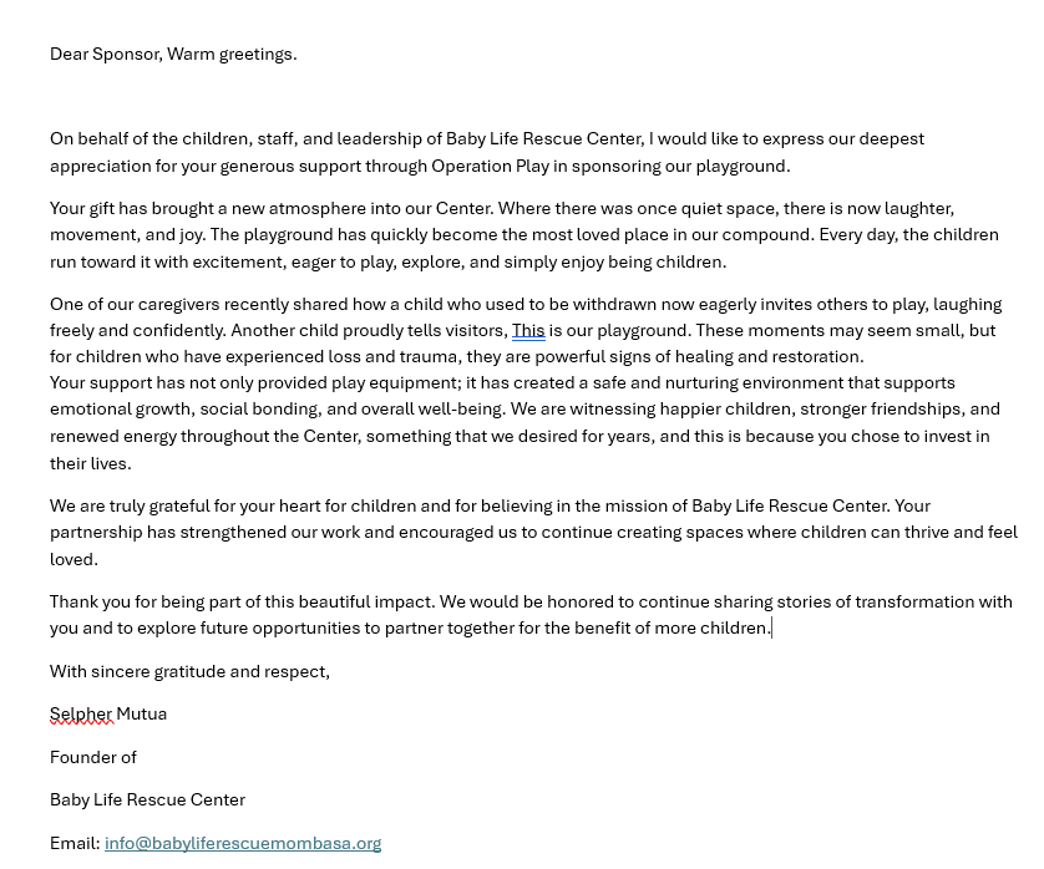 Can you imagine your childhood without memories of playing outside on the playground? No child should miss these opportunities. Thanks to your generous help, they no longer have to.