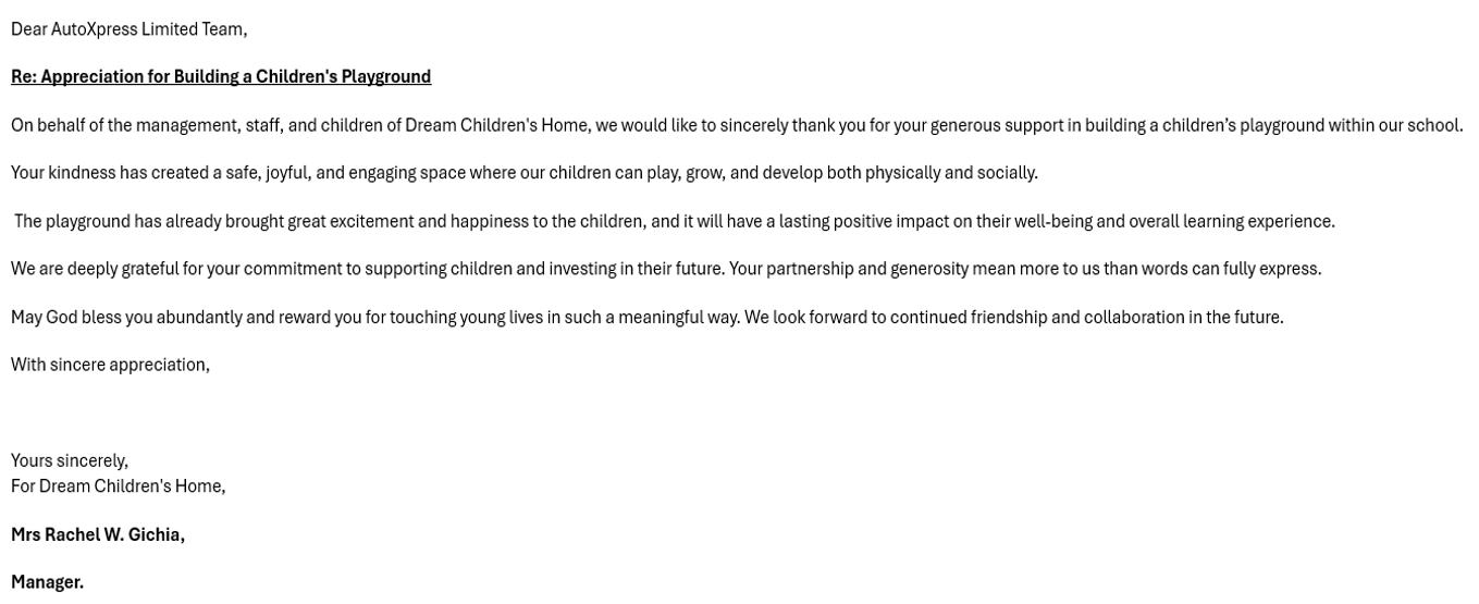 May God bless you always for your continued support for the children at the home and the community.