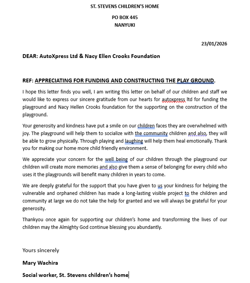 Thanks to Operation play for coordinating, AutoXpress Ltd for funding and Nancy Ellen Crooks Foundation for constructing our amazing playground.